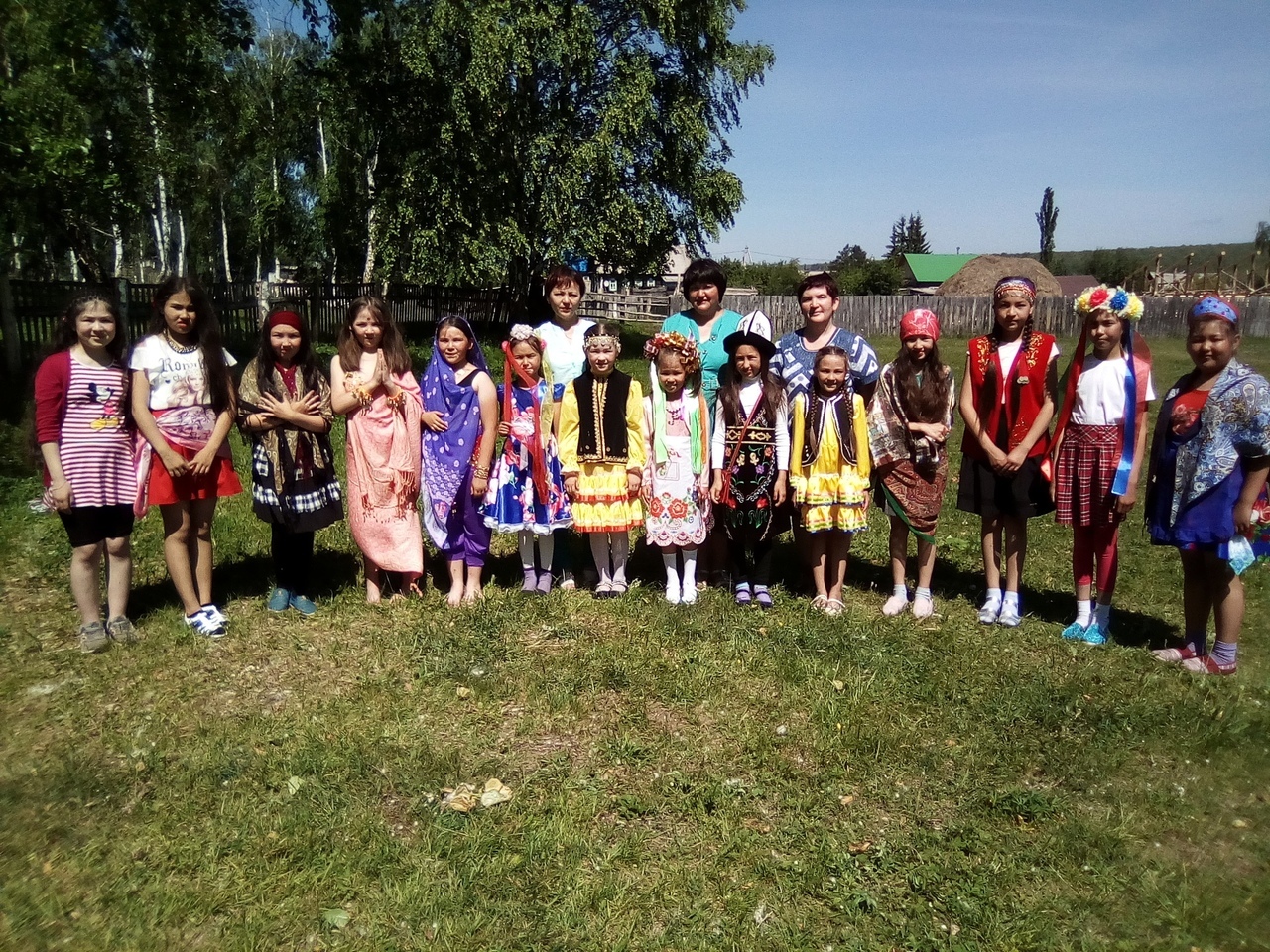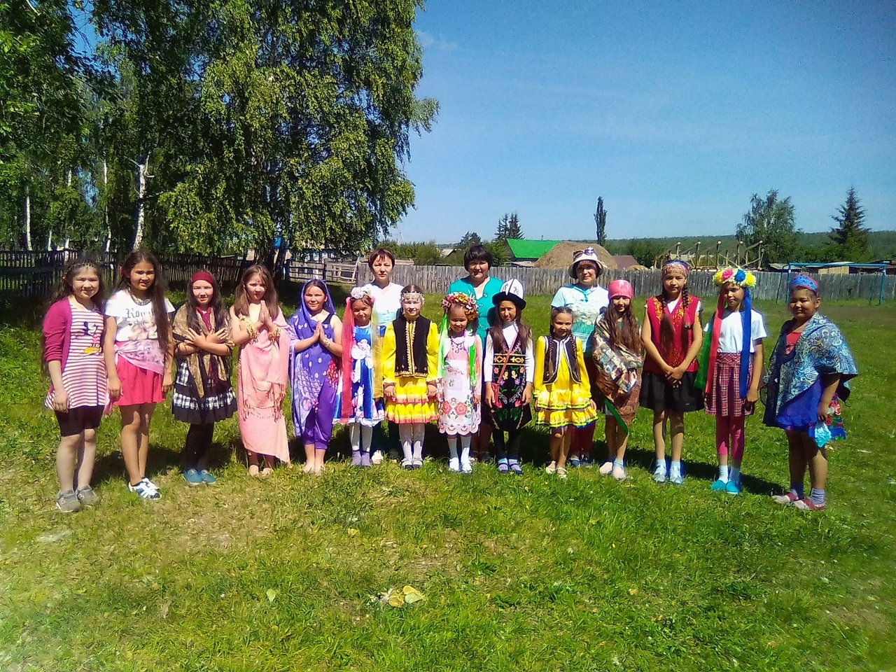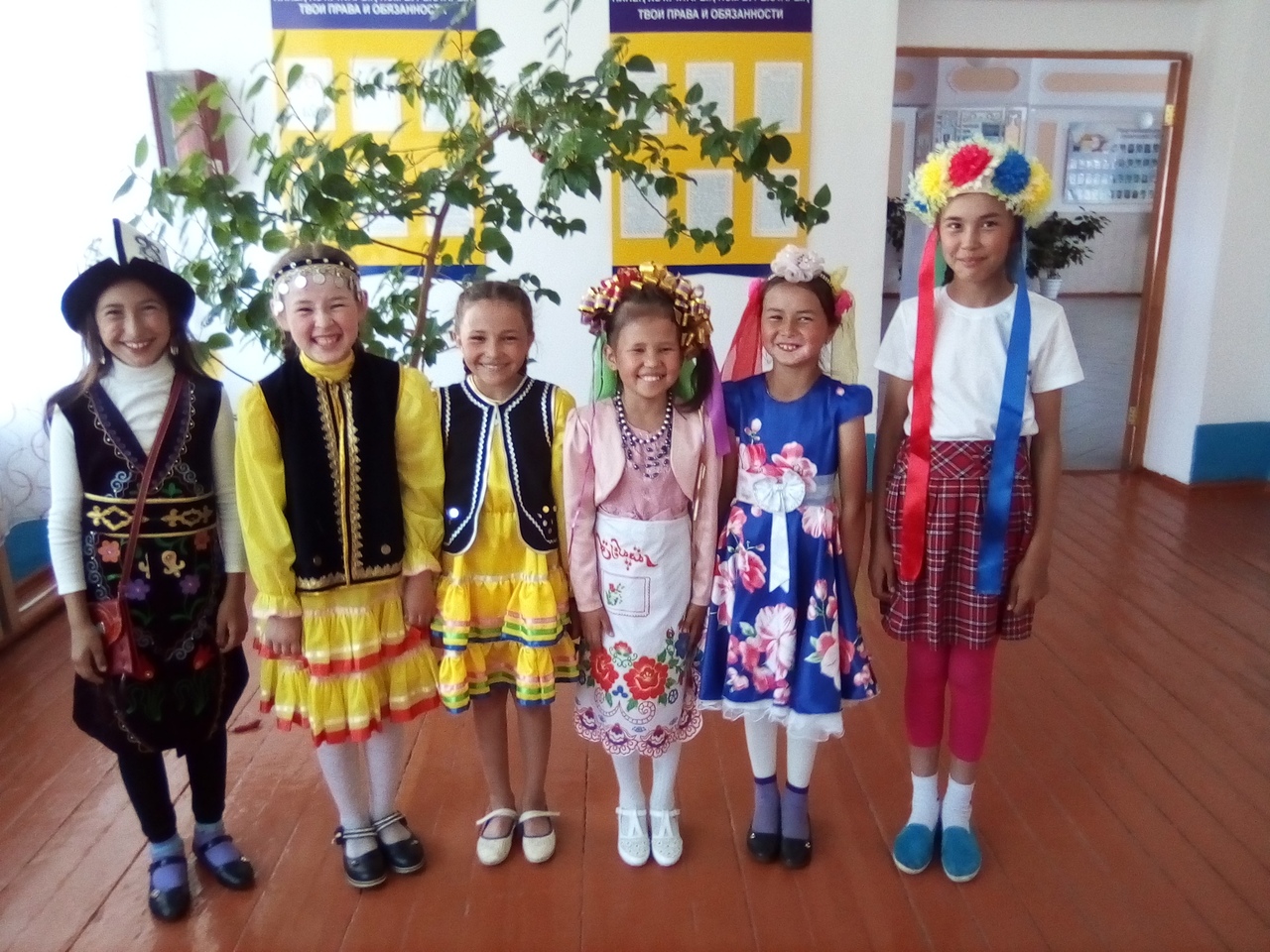 Бөгөн беҙҙең мәктәптең «Йәйләү» программаһы менән эшләүсе «Ҡояшҡай» исемле йәйге һауыҡтырыу лагерында төрлө милләт халыҡтары осрашыуы булды.Ярышта ҡатнашҡан һәр уҡыусы үҙе кейенгән милләт тураһында һөйләне.Балалар уларҙың ғөрөф – ғәҙәттәренә, хеҙмәтенә, сәнғәтенә, тарихына байҡау яһаны.