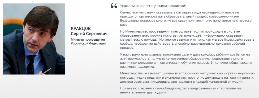 Информация о дистанционном обучении на сайте Минпросвещения России https://edu.gov.ru/distance