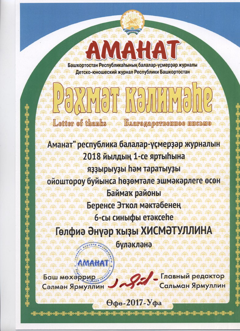 Баймаҡ районы беренсе Этҡол мәктәбенең 6-сы синыф уҡыусылары бөтөн синыф менән "Аманат"ҡа яҙылып, журнал редакцияһының Маҡтау билдәһенә лайыҡ булды! Синыф етәксеһе Гөлфиә Әнүәр ҡыҙы Хисмәтуллинаға, журналға яҙҙырыуҙы ойошторғаны өсөн рәхмәтебеҙҙе белдерәбеҙ! Яңы йылда яңы уңыштар, именлек, бар эштәрегеҙҙең дә уң булыуын теләп ҡалабыҙ!